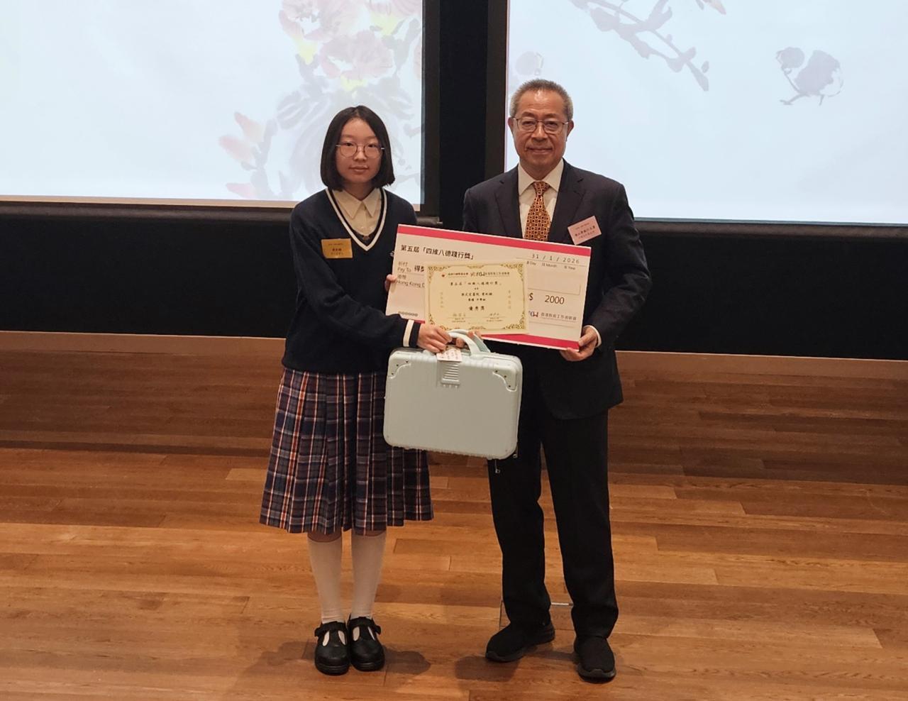 由香港教育局支持,香港教育工作者聯會及馮燊均國學基金會合辦的「第五屆四維八德踐行獎」已於日前公佈賽果,恭喜5D班曾紀穎同學榮獲中學組優秀獎!比賽目的旨在獎勵一眾學生,能夠在日常生活中努力實踐孝悌忠信、禮義廉恥等八大道德價值。據大會表示,是次比賽中合共五百多名參賽者積極參與,而優秀獎得主全港只有六名,紀穎能從中獲得如此佳績,令人鼓舞!